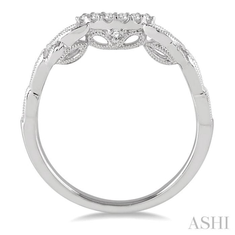 This sparkling diamond wedding band will be treasured forever. Styled on glinting 14 karat white gold this open work petal designed band showcases 9 prong and pave set round cut diamonds that shiver brilliance. Total diamond weight is 1/10 Ctw.