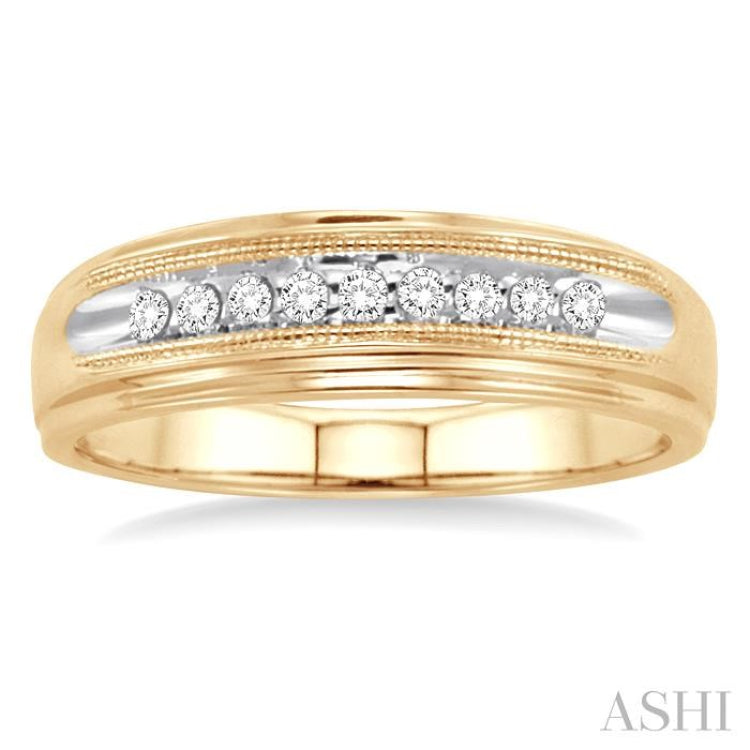 Embrace the ultimate expression of opulent elegance with this riveting diamond men's ring. Styled in 10 karat yellow gold diamond ring makes a great addition to any jewelry collection and can be worn on different occasions. This ring showcases a sparkling row of 9 brilliant round cut diamonds in nick set with milgrain. The total diamond weight is 1/8 Ctw.