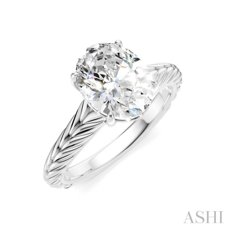 Inspired by the Japanese design, Akari, meaning 'light', this Semi-Mount diamond engagement ring offers both style and brilliance. It features an oval-shaped center mount where a center stone of your choice gets installed. The center stone should be an oval-cut diamond ranging between 1.65 Ctw to 2.35 Ctw. Adding beauty to the design are 12 microscopic split prong set round cut diamonds, pre-installed in the gallery region. An intricate Chevron carving on the shank elevates the look a notch further. The Semi-Mount diamond engagement ring is crafted in a rhodium finish 14 karat white gold. The total diamond weight is 1/20 Ctw.