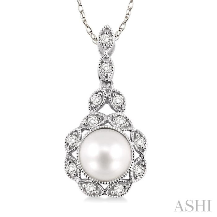 6.5 MM Cultured Pearl and 1/10 Ctw Single Cut Diamond Pendant in 10K White Gold with Chain