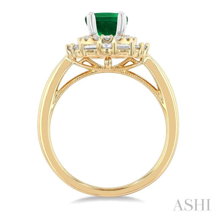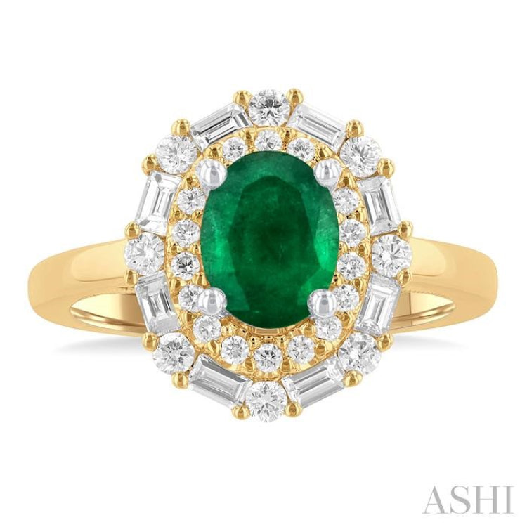 7x5 MM Oval Cut Emerald and 5/8 Ctw Baguette & Round Cut Diamond Halo Precious Ring in 14K Yellow and White Gold