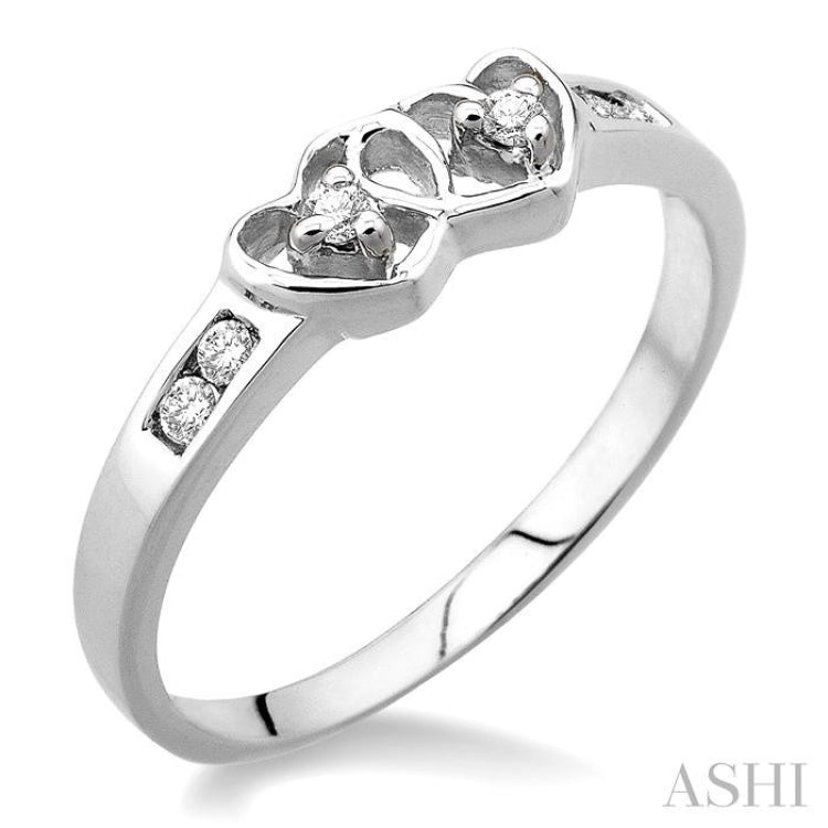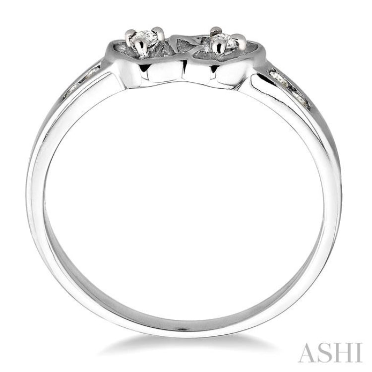 Make a lovely sentiment for your special someone with this playful interlocking heart motif diamond ring fashioned in luminous sterling silver. This beautiful ring showcases two interlocked hearts with 6 brilliant round cut accented diamonds, perfectly prong set. The total diamond weight is 1/10 Ctw.